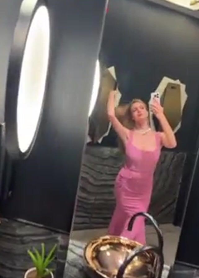 young woman in a pink dress taking a selfie in a stylish bathroom