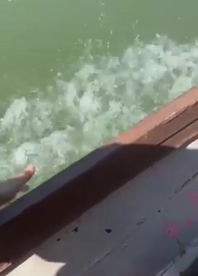 From a first-person perspective, a person is on a boat and reaches their hand towards the water. The water is turbulent with white foamy bubbles. The boat's edge is visible, painted white with pink splashes. A brown wooden rail runs along the edge of the boat.