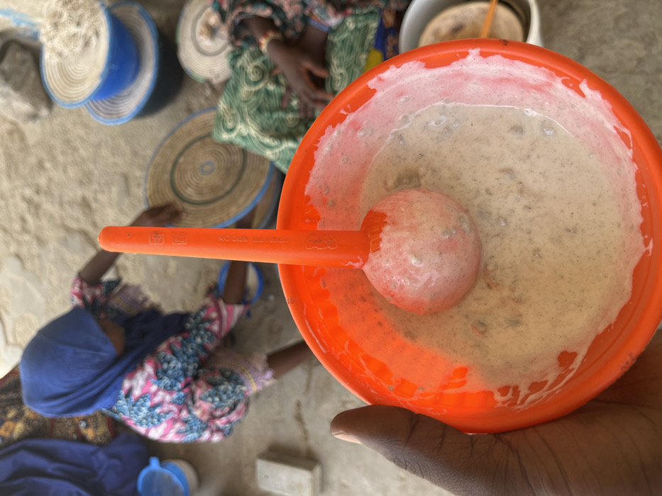 - "The scene, captured from a first-person perspective in the city of Daurawa, Nigeria, centers on a dark-skinned hand holding an orange plastic bowl filled with a light-colored, granular, semi-liquid substance" by FM-BhSYp2, licensed under CC BY 4.0