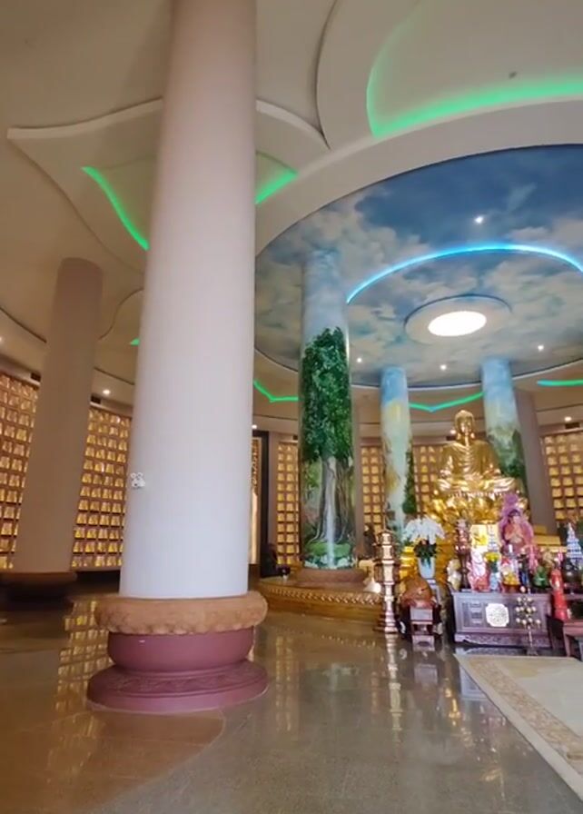 interior of a Buddhist temple. The floor is shiny and reflective. Tall white pillars support the ceiling, which features a circular design painted with a blue sky and clouds, accented by blue and green lighting. A golden Buddha statue sits at the center, surrounded by offerings on a decorated table. The walls are lined with what appear to be individual niches, possibly for remains or memorial items. No people are visible.