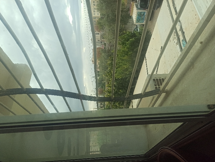 - "Looking out of a window, a metallic railing obscures a view of a street with buildings and greenery" by FM-u5tDi1, licensed under CC BY 4.0