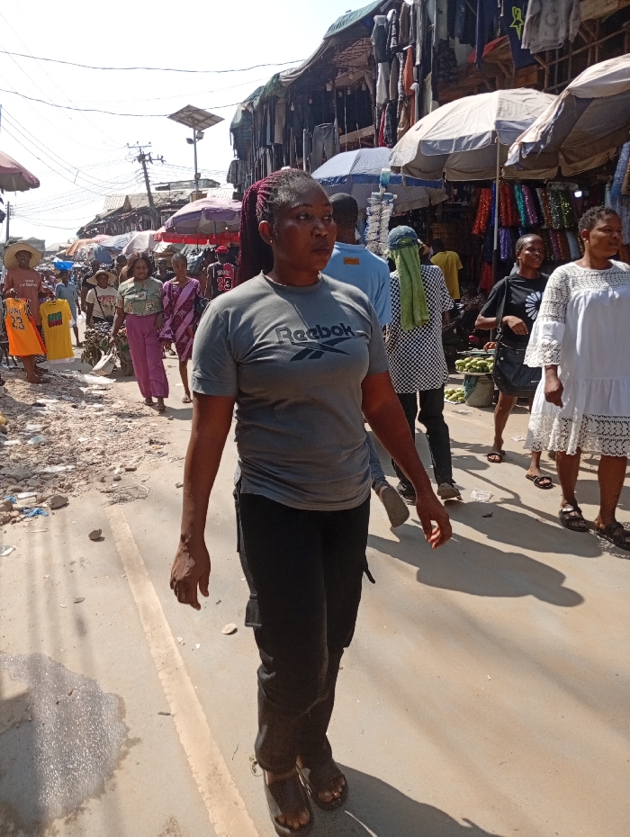 A woman in a gray Reebok t-shirt and black pants walks through a crowded outdoor market