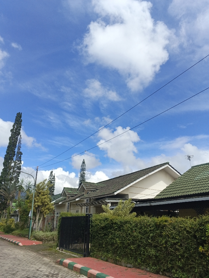 The image displays an exterior daytime scene of a residential area in ឃុំ ផាត់សណ្ដាយ, Cambodia. The upper two-thirds of the frame are occupied by a blue sky featuring scattered white cumulus clouds and lighter, wispy cirrus clouds. Two parallel, dark utility lines traverse horizontally across the mid-upper portion of the sky. The lower third of the image features a paved street in the foreground, constructed from interlocking blocks or cobblestones. A curb with distinct alternating red and green painted sections borders the left side of the street. To the right, several residential buildings are visible, characterized by pitched roofs covered with dark green tiles. The visible walls are light-colored, appearing beige or cream. One building in the mid-ground exhibits a dormer-like roof structure and a covered entry or porch area. On the roof of the building furthest to the right, a multi-element television or radio antenna is present. The properties are delineated by dense, manicured green hedges. Partially obscured behind one of these hedges is a black metal gate, likely an entrance to a driveway or pedestrian path. Various trees and shrubs are distributed throughout the scene, including several tall, slender coniferous trees (possibly cypress or pine), one prominently positioned on the far left extending high into the sky, and others in the background. A utility pole or street light fixture is partially visible on the far left. No individuals or animals are present within the frame.