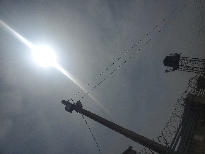 The image captures an outdoor scene in Rafin Bauna, Nigeria, under a bright, hazy sky. A prominent, intensely bright sun, positioned in the upper right quadrant, causes significant lens flare and silhouetting of foreground elements. On the left side, a utility pole, likely constructed from concrete, extends upwards, featuring a box-like apparatus near its apex. Multiple power lines emanate from this pole, stretching diagonally across the frame towards the right. In the lower left, a dark-toned wall or fence structure is visible, topped with coils of concertina wire. Towards the mid-right, a dark, metal-framed water tower with a square-shaped tank and platform at its summit stands against the sky. No individuals are visible.