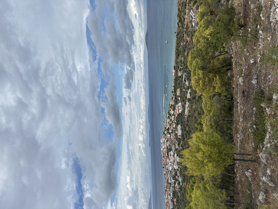 This is an elevated panoramic outdoor image depicting the town of Megalochori, Greece. The foreground consists of a rocky, dry, reddish-brown slope with sparse vegetation and several prominent trees featuring light green to yellowish foliage. Beyond this, the midground reveals dense clusters of green trees, likely olive groves, transitioning into the tightly packed white and off-white buildings with terracotta or reddish-brown tiled roofs of Megalochori, situated directly on the coastline. A harbor area is visible with a pier extending into the water and multiple small boats, including sailing vessels and motorboats, anchored in the clear, turquoise-blue sea. The background features the expansive blue-green water of the sea, with several distant, hazy landmasses or islands visible on the horizon. The sky overhead is partially overcast, dominated by large grey and white cumulus clouds, interspersed with areas of lighter blue sky. No individuals or specific human actions are discernible.