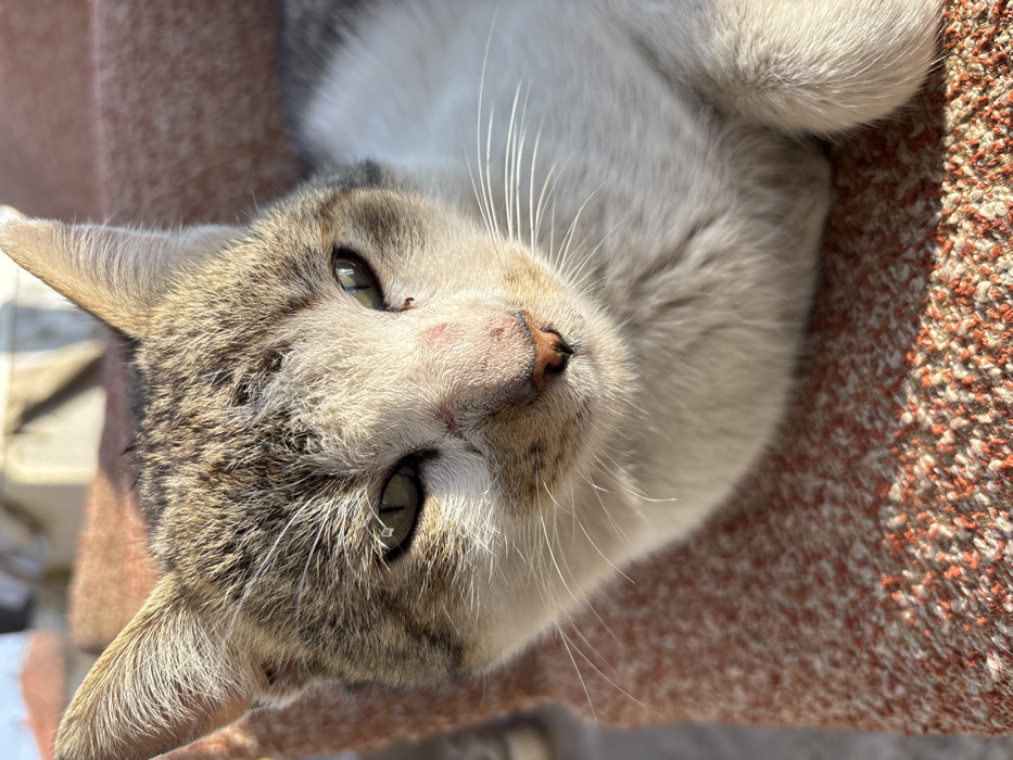 - "A domestic cat, predominantly white with brown and grey tabby markings on its head and back, is depicted resting outdoors in Slavyanovo, Bulgaria" by FM-naVU72, licensed under CC BY 4.0