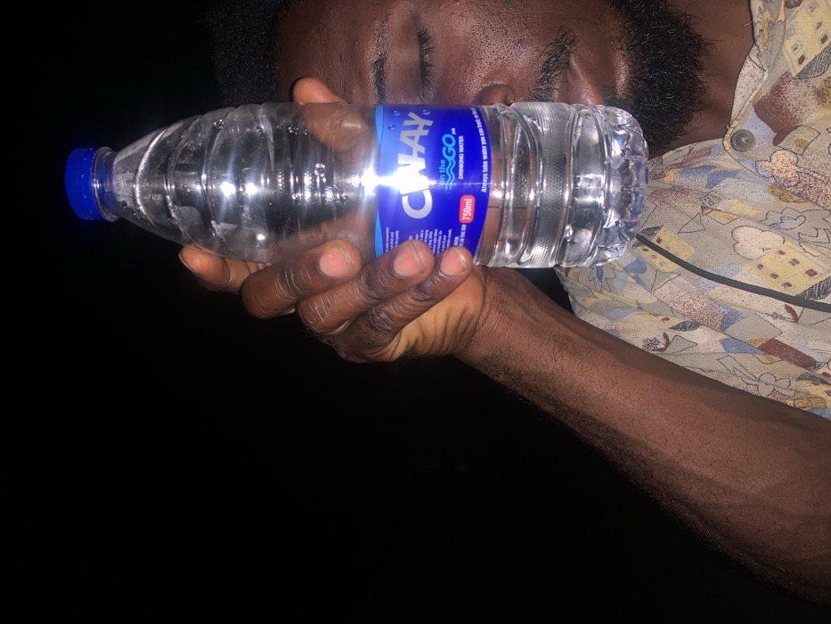 A person is holding a plastic bottle of water close to their face. The bottle, which has a blue cap and label, appears mostly full. The person has dark skin, a beard, and is wearing a patterned shirt with buttons. The background is dark.