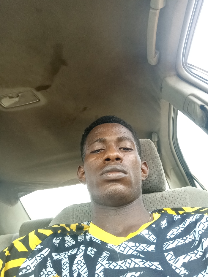 A man sits in a car, gazing into the camera. His dark hair is closely cropped, and he wears a patterned shirt with yellow accents. The car interior is visible, showing a stained ceiling, a window, and a seat headrest. The overall lighting is bright, suggesting daylight. The man's expression is neutral, with a slight upward tilt of his head.