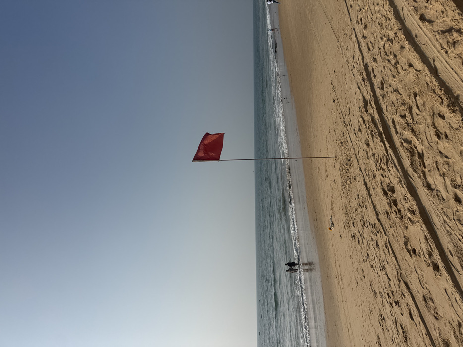 The image depicts a wide shot of Sinquerim Beach in Sinquerim, India, under a clear, pale blue sky. The scene is bisected horizontally by the horizon, with the sky occupying the upper half and the beach and ocean the lower. A prominent red rectangular flag, unfurled by a light breeze, stands on a slender pole in the mid-ground, positioned slightly right of the frame's vertical center. The flag pole is embedded in the dry, golden-brown sand of the beach. The ocean, visible beyond the shoreline, is a medium blue-green with white-capped waves breaking gently onto the shore. On the far left horizon, two small vessels are visible. A small, dark structure, possibly an oil rig or platform, is present on the horizon slightly right of center. Along the wet sand shoreline on the left, two individuals are seen wading in the shallow water, facing away from the camera. Their reflections are visible in the water. Further right, along the waterline, several small birds are scattered. Two additional individuals are present on the right side of the frame; one walks on the wet sand closer to the ocean, and another is partially visible at the extreme right edge of the dry sand. The dry sand in the foreground shows multiple parallel tire tracks and scattered footprints. A small, light-colored object, possibly a discarded item or bag, lies on the sand near the base of the flag pole. The sunlight is bright, indicating daytime conditions.