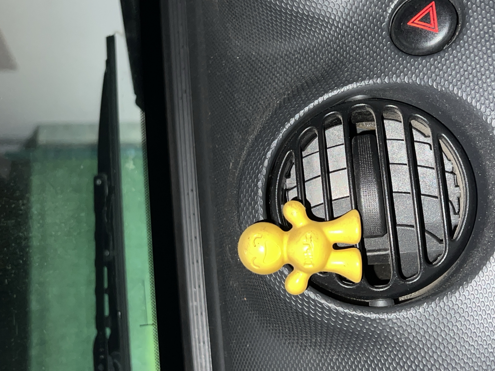 This image depicts the interior of a vehicle, specifically the dashboard and lower portion of the windshield, located in the city of Kornitsa, Bulgaria. A yellow "Little Joe" air freshener, shaped like a smiling humanoid figure, is positioned centrally, mounted on a circular black air vent. The vent features multiple horizontal slats. To the right of the air vent, a black circular button with a red triangular hazard symbol is visible. The dashboard material is a dark grey or black, textured with a repeating geometric pattern. Above the dashboard, the lower section of the windshield is visible, showing two black windshield wiper blades at rest. Beyond the windshield, a blurry green background is reflected, possibly indicating foliage or a green structure, with some lighter areas suggesting ambient light. No individuals are visible.