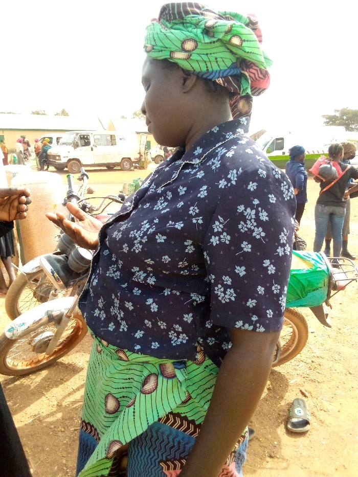 A woman wearing a blue, floral-patterned blouse and a colorful green and blue patterned wrap stands near a parked motorcycle. She also wears a multi-colored headwrap. People and vehicles are visible in the background near a building. A single sandal rests on the ground. The ground appears to be dirt or sandy soil.