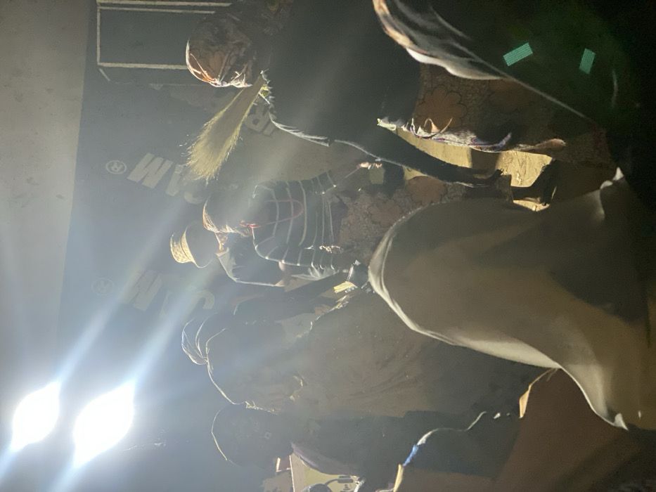 A group of people stand in a dimly lit room. Some individuals wear hats and masks, while one person holds what appears to be a broom. The light sources create strong flares, obscuring details. A patterned rug lies on the floor, and a dark panel with white lettering is visible in the background. The overall scene is unclear and lacks sharp focus.