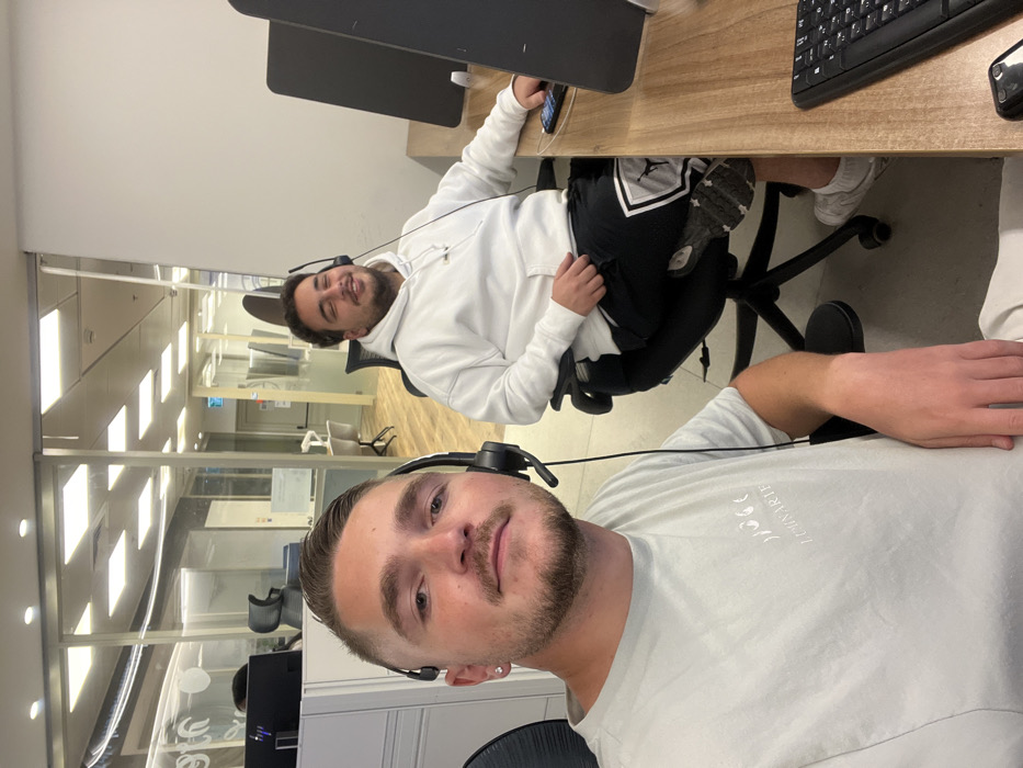 The image portrays an indoor office environment in Unknown, Unknown, featuring two males at separate workstations
