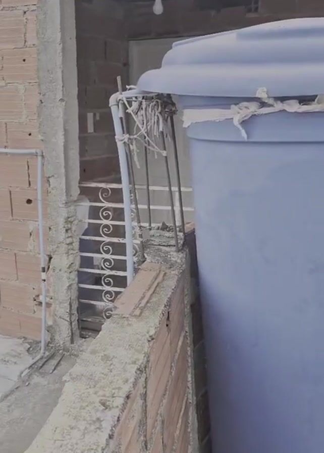 The camera pans from a blue water tank on a rooftop to a view of the city below. The rooftop has a brick wall and metal stairs, and several other rooftops are visible in the view of the city. Mountains are visible in the distance. The buildings in the city are a mix of tall apartments and small homes. The sky is overcast.