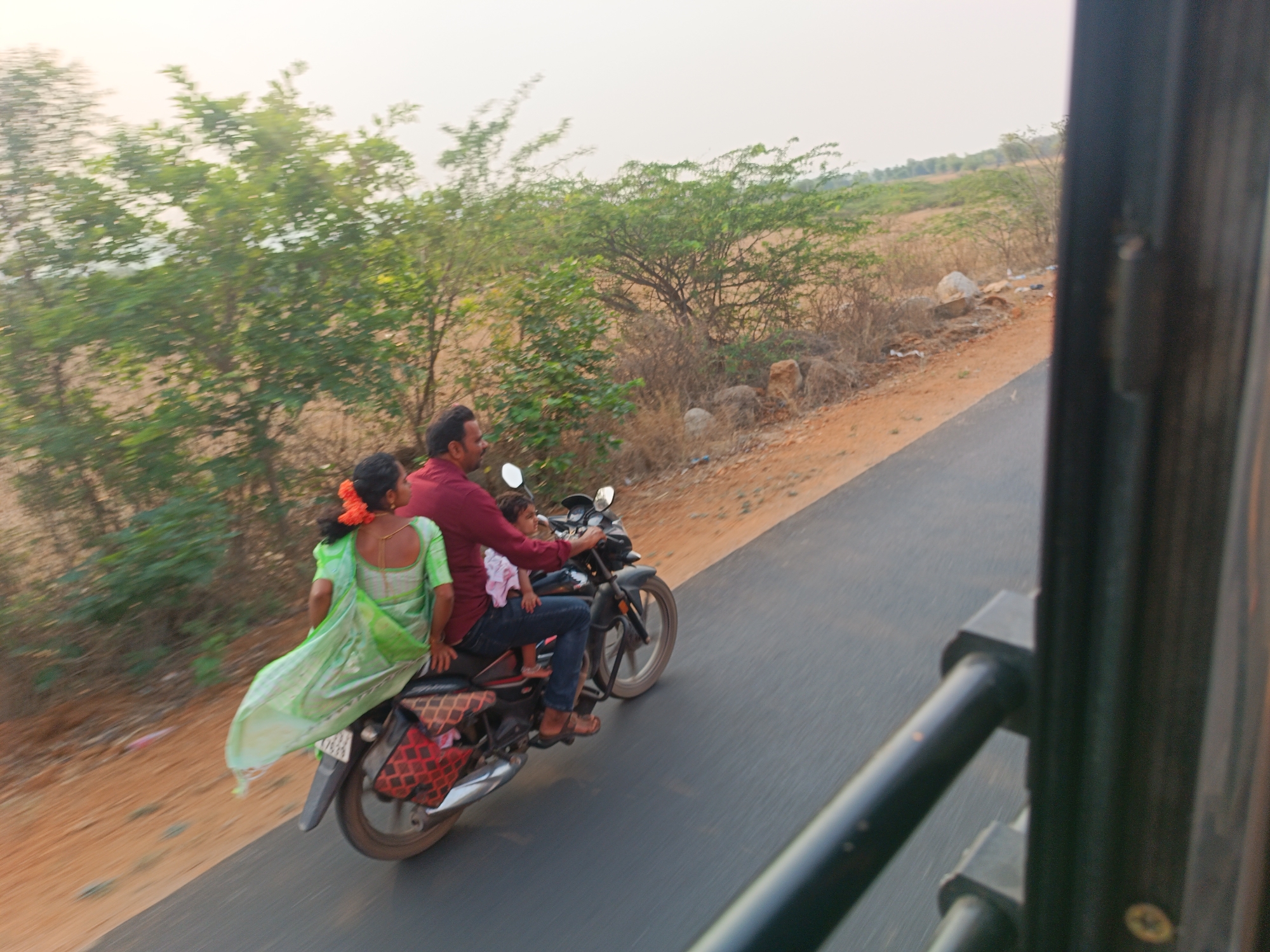 Captured from within a moving vehicle, the image shows a man driving a motorcycle with a woman riding on the back and a small child sitting in front of him on the seat of the bike. The man is wearing a red shirt and jeans, while the woman has on a green sari. They are traveling along a paved road that is bordered by trees and shrubs on one side and open fields on the other. The photo was taken in Kothacheruvu, India.