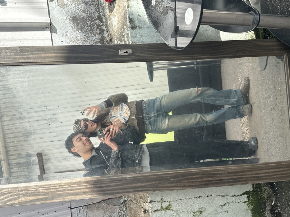 An outdoor mirror selfie taken in Neuilly-Plaisance, France, depicts two individuals