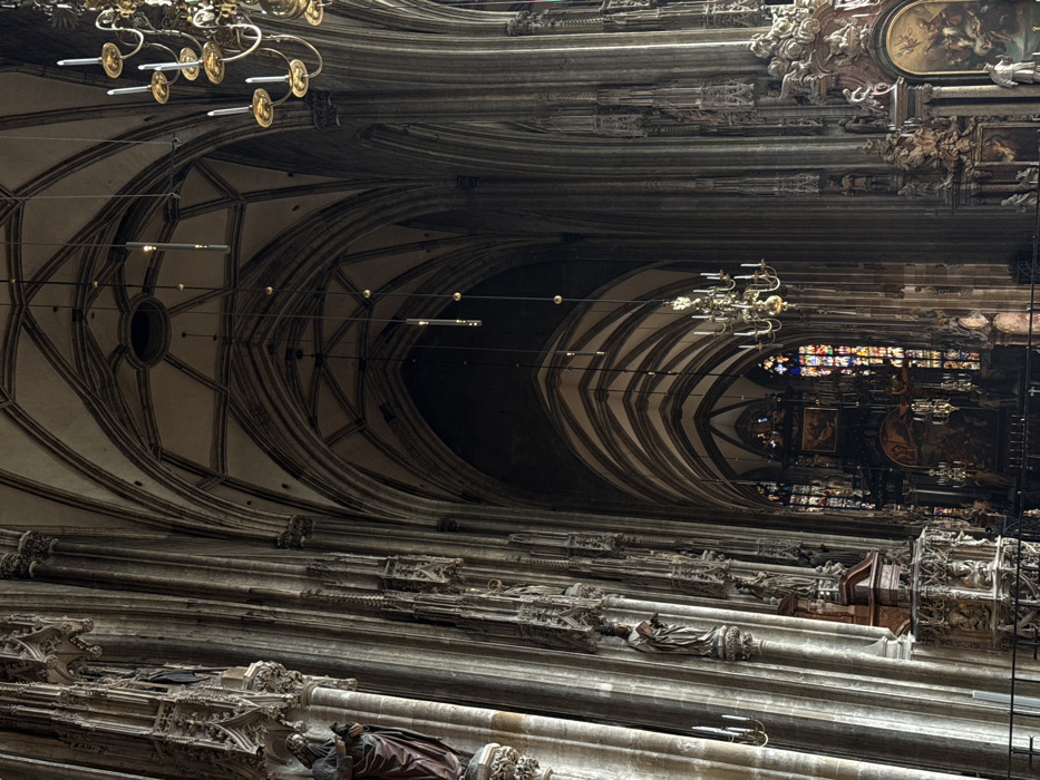 This image depicts the interior of St. Stephen's Cathedral (Stephansdom) in Vienna, Austria. The scene captures a section of a high-ceilinged Gothic nave or aisle, characterized by dark, ribbed stone vaults extending across the overhead space, one segment featuring a circular oculus. Tall, fluted columns line the structural elements, adorned with intricate stone carvings and niches containing various sculpted figures. Notable statues include a robed figure holding a book and another male figure with a beard, both affixed to columns. The interior is dimly lit, with illumination provided by multiple modern, minimalist cylindrical pendant lights suspended at varying lengths from the ceiling, and by two traditional, multi-arm gilded chandeliers, one positioned in the upper right quadrant and another lower in the central-right, both designed to hold candles (some appear to be electric). In the background, beyond the immediate structural elements, stained glass windows displaying vibrant, multi-paneled designs are visible, illuminating an elaborate altarpiece or reredos featuring ornate carvings and paintings. An additional, highly ornate structure containing a large painting is present on the far right side of the image. No individuals are present within the frame.