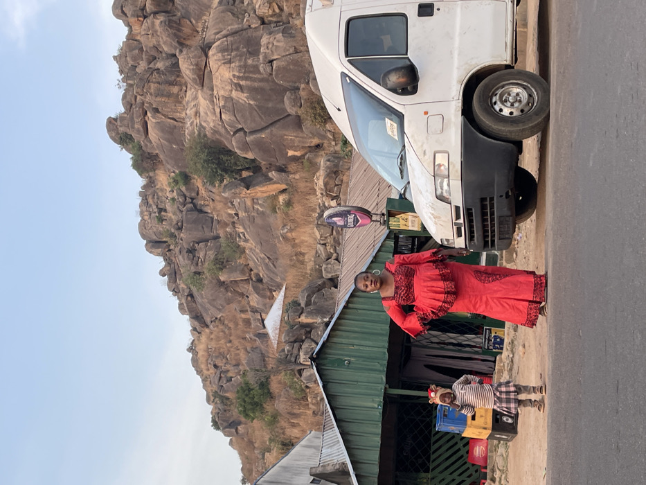 The scene depicts a street in Rukuba Road, Nigeria, against a backdrop of a prominent rocky mountain covered with sparse, dry vegetation under a clear, light blue sky