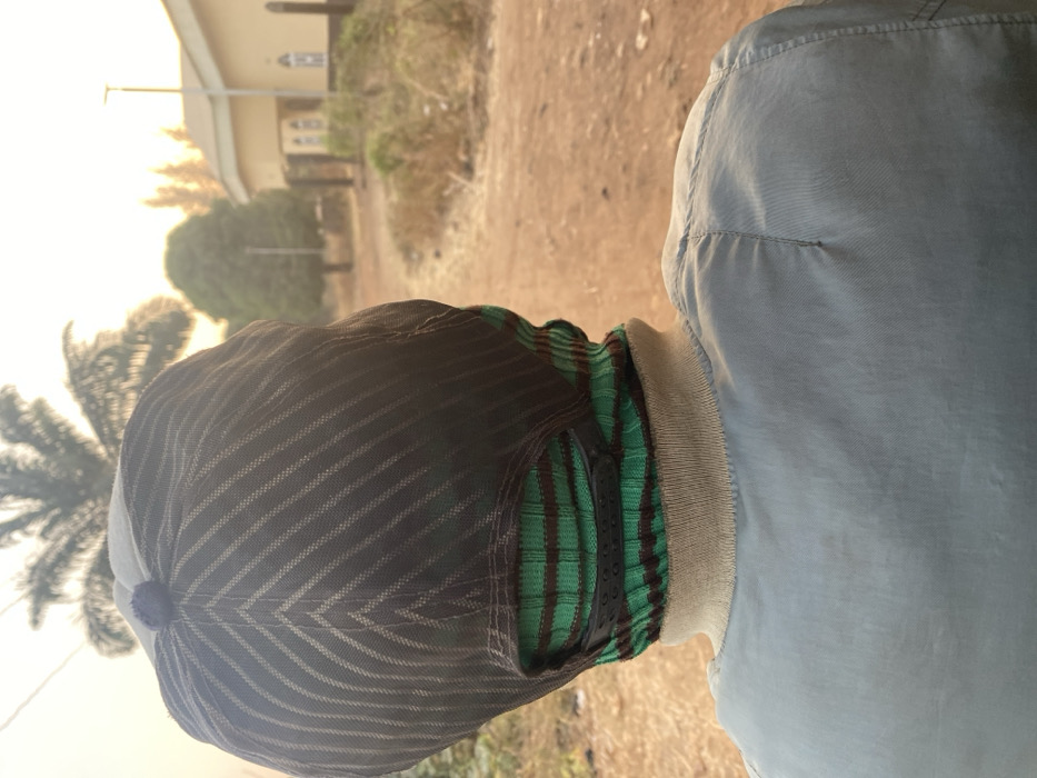 A person wears a striped cap with a green and brown adjustment strap, paired with a light blue denim shirt. A light-colored ribbed collar is visible. The background shows a dusty path, sparse greenery, a palm tree, and a light-colored building in the distance under a hazy sky. The photo appears to be taken outdoors in warm, somewhat dry conditions. The subject's face is not visible.