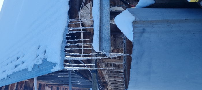 The image depicts an outdoor winter scene in Rusalevka, Russia. In the upper half, a light-colored corrugated metal roof, covered by a significant layer of white snow, slopes downwards from the left. Numerous transparent icicles of varying lengths (ranging approximately from 15 to 40 cm) hang from the edge of this roof. Directly beneath the icicles and extending horizontally across the mid-ground is a robust, snow-covered metal beam, possibly galvanized steel, with a roughly square or rectangular profile. Behind this beam and the icicles, the weathered, dark brown wooden facade of a building or structure is visible, constructed from horizontal planks. The lower portion of the image is dominated by a light-grey concrete or stucco wall, the top edge of which is also covered in a layer of white snow. The scene is illuminated by bright, clear natural light, indicating a cold, sunny winter day. No individuals or active subjects are present.