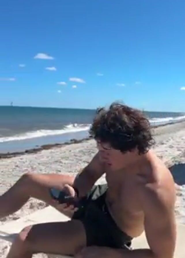 sunny day at the beach. A man is sitting in a white lounge chair looking at his phone. The beach is white sand and there is seaweed on the shoreline. The ocean is blue and calm with small waves. There are other lounge chairs with umbrellas nearby. The sky is blue with a few clouds. Another man is seen briefly sitting in a chair, also looking at his phone. Someone is filming from behind, then pans across the beach scene.
