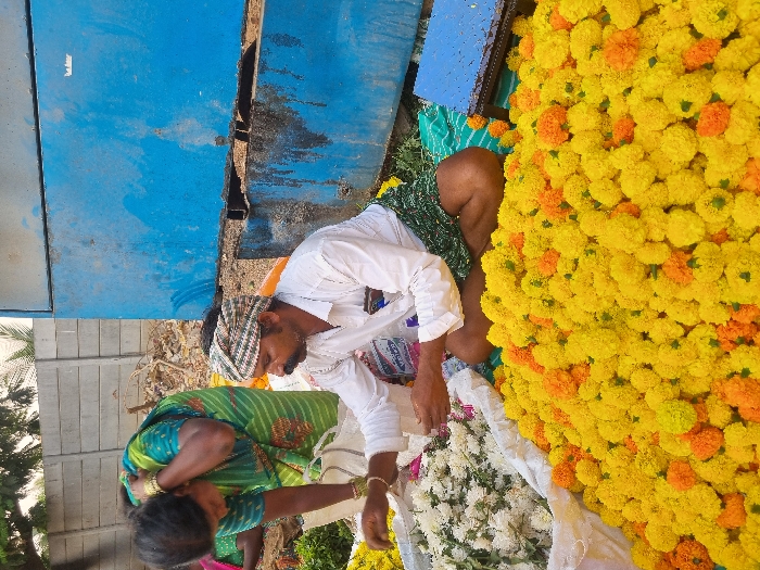 An outdoor scene in Enumulapalli, India, depicts a man and a woman engaged at a flower stall