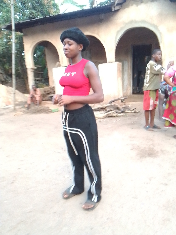 The image displays an outdoor scene in an unpaved area in front of a light-colored building with a corrugated metal roof and two arched doorways, located in the city of Unknown, Unknown. A young female, positioned centrally and angled slightly right, wears a red sleeveless crop top with "WET" in white text, black track pants with double white vertical stripes, and dark flip-flops. She has dark hair, possibly covered by a black beret, and her gaze is directed slightly downward. Her hands are loosely held in front of her lower abdomen. In the mid-ground to the right, a young male stands facing left, wearing a light green patterned t-shirt, red shorts, and flip-flops. Partially obscured behind him is another individual in a pink top and a red, green, and yellow patterned skirt. To the far left background, a person in light brown clothing is seated near a pile of dirt or sand. A pile of wooden branches or firewood is visible on the ground between the central female and the group on the right. Green foliage is present above the building. The ground consists of light brown dirt or sand.