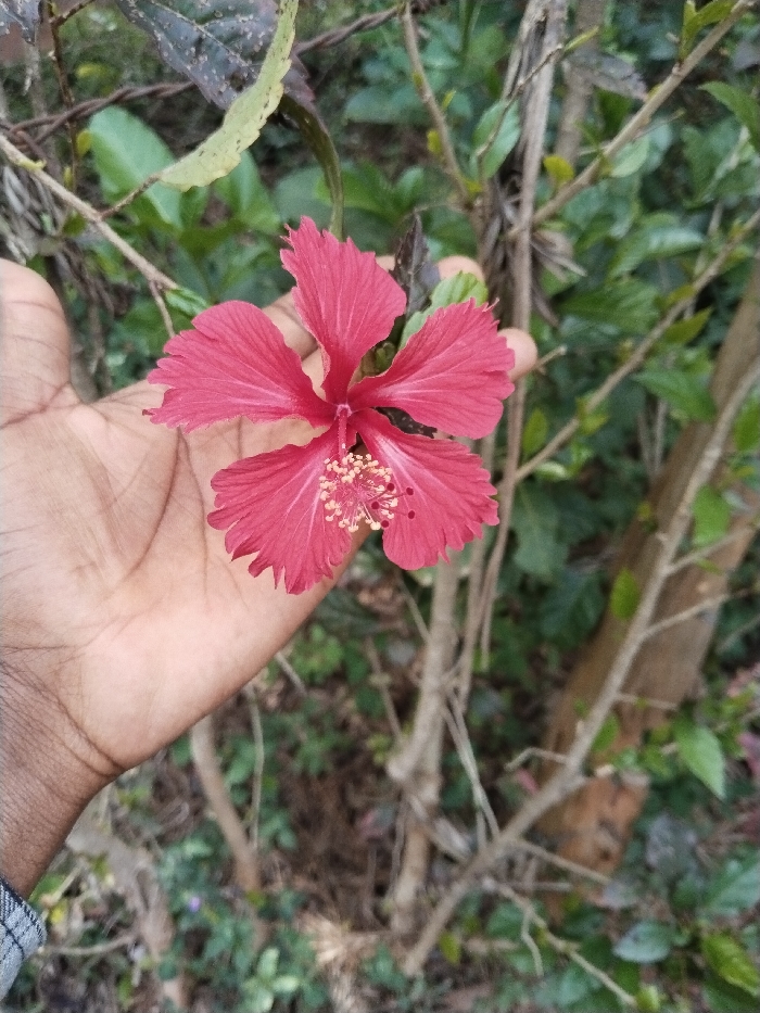 A close-up shot exhibits a vibrant red hibiscus flower held in a human hand. The flower displays five ruffled petals with a prominent stamen and pistil at its center. The backdrop includes a leafy bush with varying green hues and slender, bare branches. The lighting appears natural, enhancing the colors and textures of both the flower and the surrounding foliage. The image captures a moment of appreciation for nature's beauty.