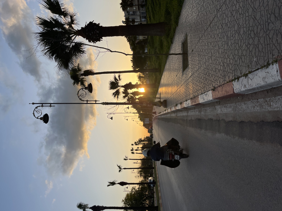 The image captures an urban street scene in Fez, Morocco, during either sunset or sunrise. A lone individual, wearing a light-colored helmet and dark clothing, rides a dark moped away from the viewer along the right-hand lane of an asphalt road. Two dark, possibly soft-sided, objects are suspended from the rear sides of the moped. The road features a white centerline and is bordered by a red and white painted curb. To the right, a patterned tiled sidewalk extends alongside a strip of grass and multiple tall palm trees. A young, bare-branched tree is planted in a square cutout on the sidewalk. Numerous ornate dark metal streetlights with scrolled arms line the street. The sun, a bright orange orb, is low on the horizon, partially obscured by distant trees, casting a warm glow across the scene and reflecting on the sidewalk. The sky above transitions from blue to orange and yellow, with scattered stratocumulus clouds. Additional vehicles are visible in the distance on the road, and buildings are faintly discernible through the trees.