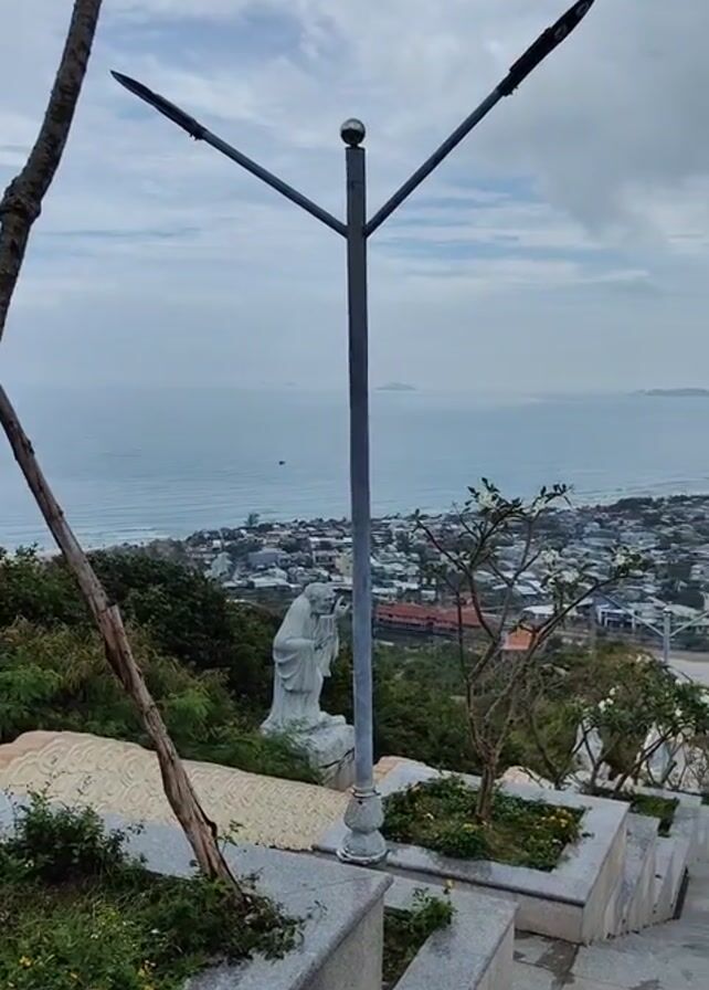 The video captures a scenic overview of a coastal town from a high vantage point, presumably from a hillside or temple complex
