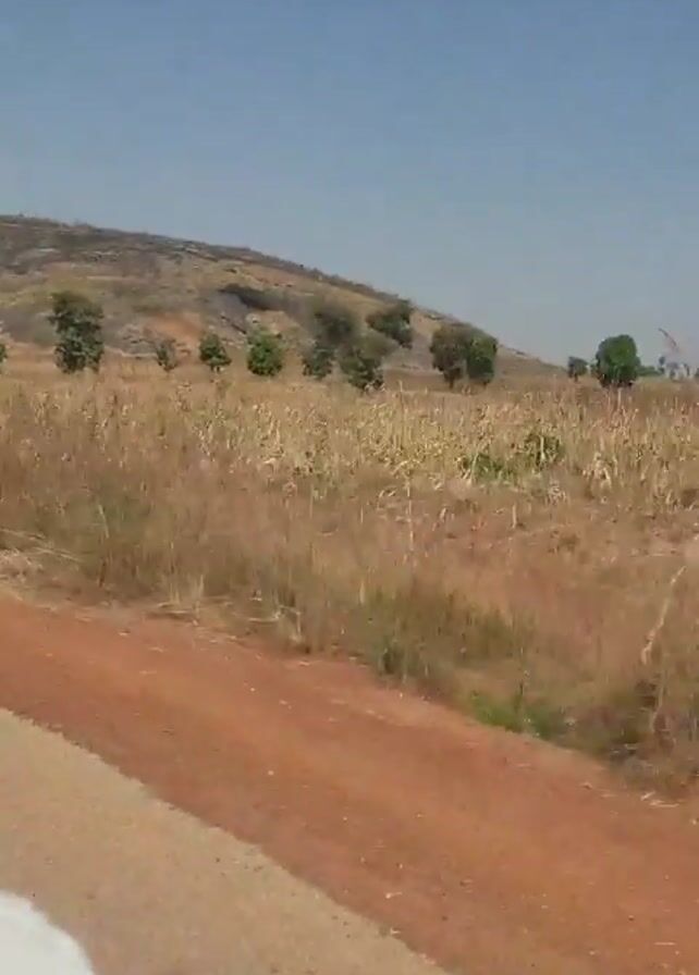 The video depicts a person driving or riding along a road with dry, grassy fields on the right and a rocky hill in the background under a clear blue sky. The road has both paved and dirt sections. The field appears to be overgrown with dry grass and some small trees.