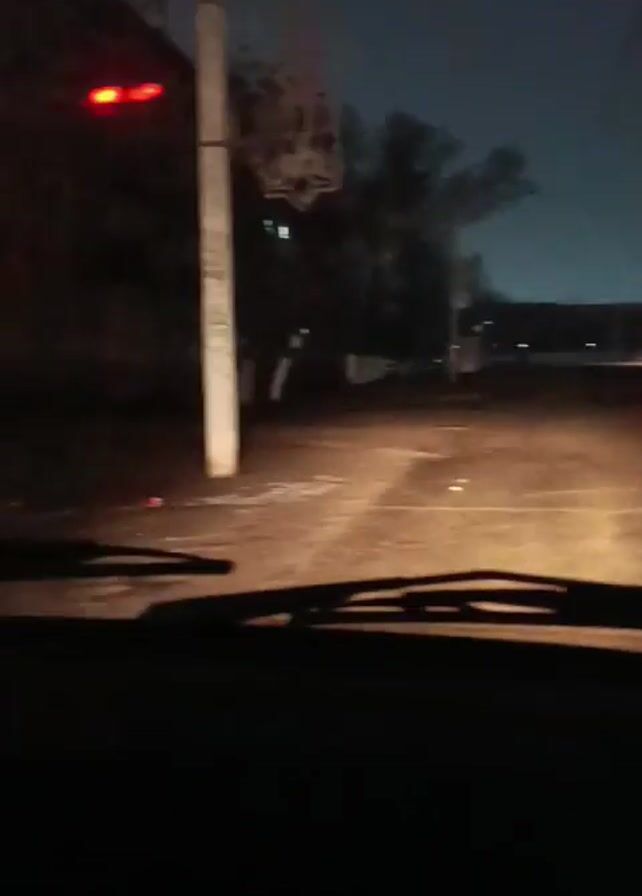 A car is moving down a dark, poorly lit street at night. The car’s headlights illuminate the road ahead, revealing a cracked and uneven surface. On either side of the street, there are buildings and trees silhouetted against the night sky. There is a red light visible on a pole to the side, and another set of red lights in the distance, likely from another vehicle. The windshield wipers are visible in the foreground. The overall atmosphere is bleak and gritty.
