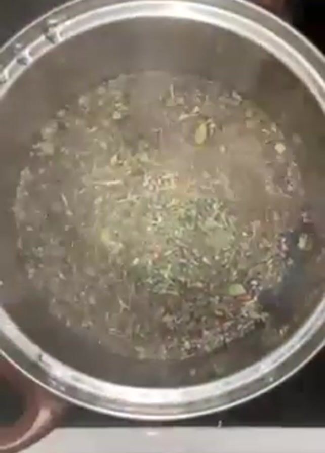 A top-down video shows a stainless steel pot containing a simmering liquid with various dried herbs and plant matter