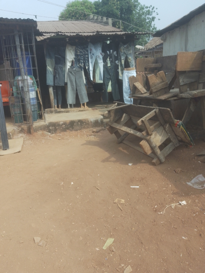 This image captures an outdoor commercial scene in Idah, Nigeria. The ground in the foreground is reddish-brown compacted earth, sparsely scattered with small pebbles, fragmented debris, and a white cigarette filter. To the left, a small, open-front shop with a corrugated metal roof stands on a raised concrete plinth. Inside and beneath its overhang, multiple pairs of trousers and shirts in various shades of blue, grey, black, and white are displayed on mannequins or hung. Immediately to the shop's left, a vertical metal grillage structure is visible, partially obscuring an orange chair. In the mid-ground to the right, a roughly constructed wooden frame, consistent with an overturned stall, lies on its side. Adjacent to it and further right, a haphazard pile of wooden planks and disassembled wooden components is present. The background features a light-colored building with a dark roofline, along with green trees and foliage beneath a hazy light blue sky. No individuals are visible.