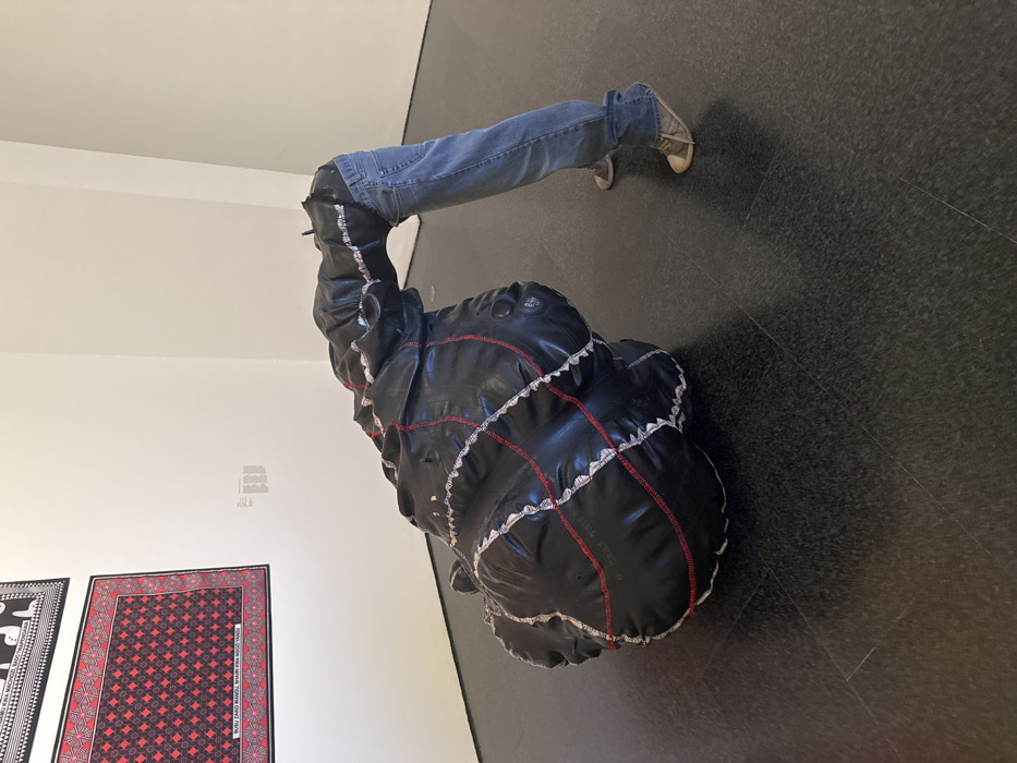 The image displays an indoor scene within an art gallery in Barcelona, Spain. The central subject is a large, irregularly shaped sculpture positioned on a dark grey tiled floor. The sculpture's main body is black, appearing to be crafted from a quilted or segmented material, possibly synthetic leather, with prominent red and white stitching creating a grid-like pattern. Extending from this mass is a single leg-like structure composed of blue denim jeans, arched upwards and then downwards, terminating at the floor with a pair of light-colored canvas shoes. The surrounding environment consists of plain white walls. On the left wall, two framed textile artworks are mounted: an upper piece featuring black and white patterns, and a lower piece displaying red and black geometric patterns with text along its bottom edge. A small block of informational text is also visible on the white wall behind the sculpture. No individuals are present in the frame.