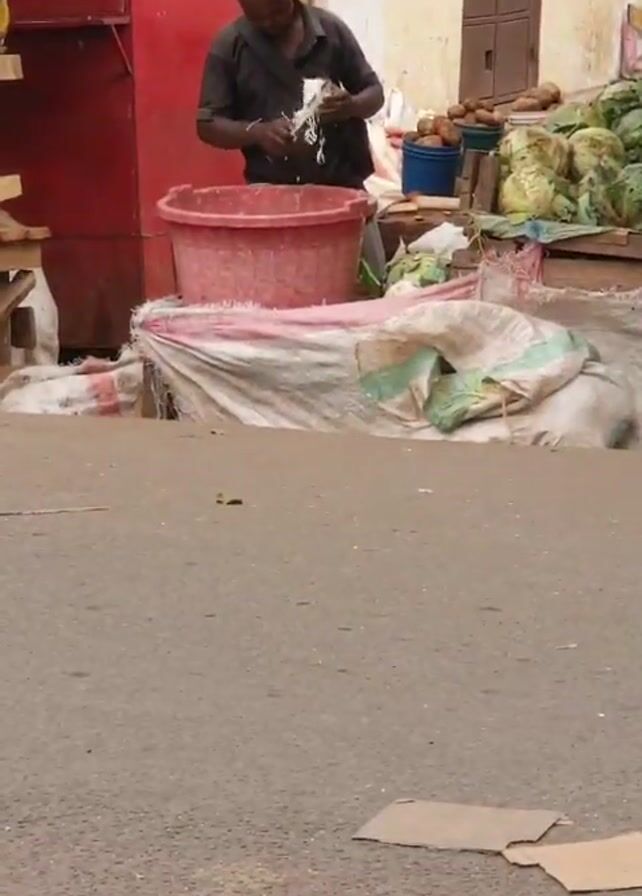 man standing behind a red plastic tub, peeling a white bulb-like vegetable. There are sacks of other produce visible nearby. People on motorcycles and on foot pass by the man as he works. The scene appears to be a street market or a roadside stand. The road is paved, and buildings are visible in the background.
