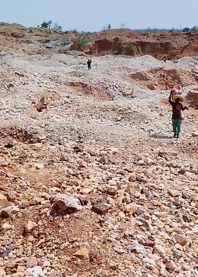 dry, rocky terrain resembling a quarry or mine. One person walks across the landscape carrying a load on their head. The camera then pans over pools of muddy water and excavated areas. Further in the distance, there are several people gathered on a rise. They appear to be working or resting near what looks like a small encampment. The overall impression is of a rugged, arid environment where some form of manual labor is taking place.