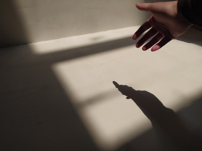 The scene depicts an interior corner formed by two perpendicular, light-colored walls with a textured surface. Strong, direct illumination, consistent with sunlight, enters from the right, creating a distinct rectangular patch of brightness on the right wall and casting sharp, elongated shadows on the left wall. A human left hand is visible in the lower right foreground, partially illuminated, with its palm open and fingers slightly extended. A prominent shadow of a human arm and hand is cast on the left wall, elongated, with the shadow's hand appearing to point or reach upwards. The specific location within the city of Kuyeda, Russia, cannot be determined from the visual information provided in the image.