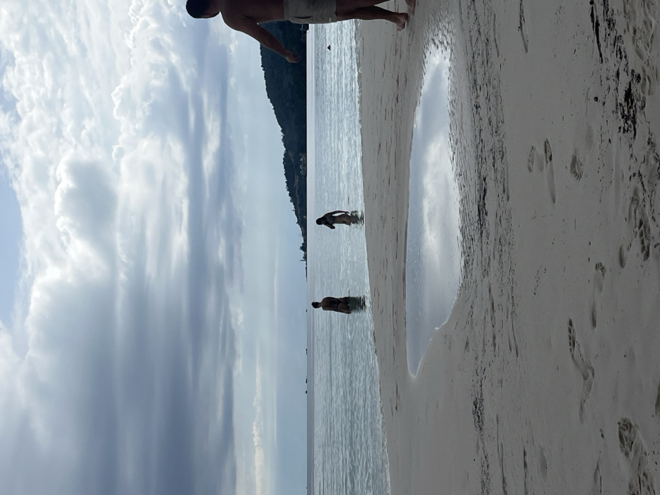 The image captures a beach scene in Preah Sihanouk, Cambodia, under a partly cloudy sky with prominent grey and white cloud formations. The foreground consists of light-colored sand, marked with numerous footprints, featuring a large, irregularly shaped puddle reflecting the sky. In the midground, the calm, light blue-green ocean extends to the horizon. Two individuals are standing in the water: one female figure, partially silhouetted, is waist-deep with her back mostly to the viewer, wearing a dark swimsuit; another female figure is standing calf-to-thigh deep, facing away and slightly right, wearing a light-colored swimsuit. On the far right foreground, a male figure, shirtless and wearing light-colored shorts, is walking away from the viewer along the sandy shore. In the distant background, a verdant, tree-covered landmass is visible on the right, with a small, white lighthouse-like structure identifiable near its left edge. Several indistinct shapes, possibly distant boats, are discernible on the horizon line over the water.