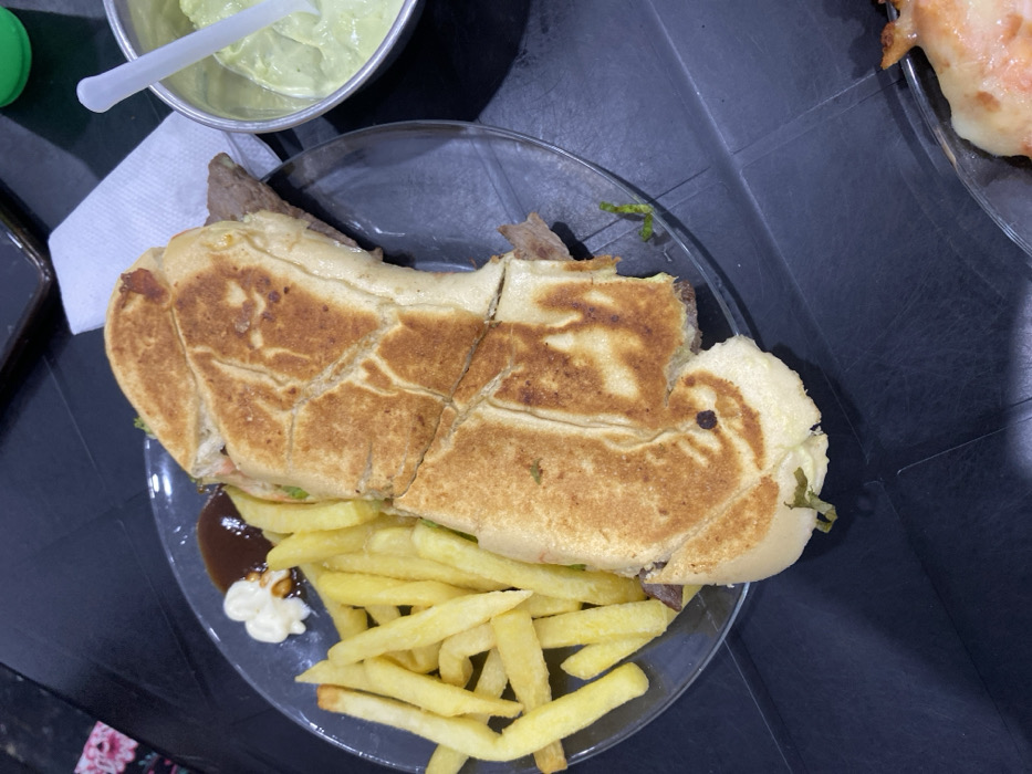 - "A sandwich cut into four pieces sits on a clear plate over a bed of french fries" by FM-33abC2, licensed under CC BY 4.0