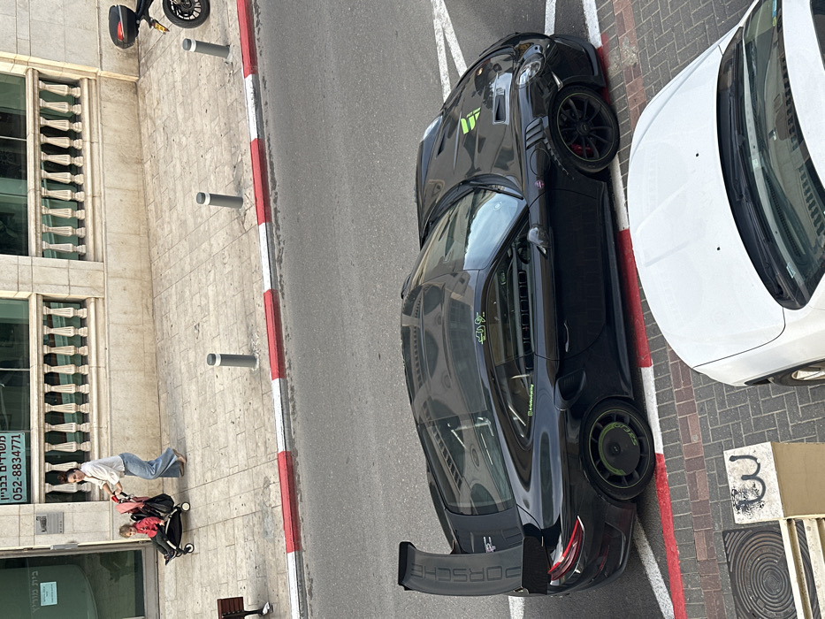 An overhead, high-angle view depicts a street scene in Tel-Aviv, Israel. A black Porsche 911 GT3 RS is centrally parked parallel to a red and white painted curb, indicating restricted parking. The vehicle features a large rear wing with "PORSCHE" lettering, green accents on the hood and left rear wheel, a visible interior roll cage, and stickers including "AristoRacing" and Arabic script "الله اكبر" on its side and roof. In the immediate foreground, the hood and windshield of a white vehicle are partially visible. On the paved sidewalk in the background, a woman wearing a light top and blue jeans pushes a black stroller containing a child in a red top, moving from right to left across the frame. Three gray and white bollards line the sidewalk edge. Behind the sidewalk, a light-colored building displays ornate stone balustrades and large reflective windows. A sign on the building entrance reads "משרדים בבניין" (Offices in the building) and "052-8834771". The rear wheel and fender of a black motorcycle are partially visible parked on the far right of the sidewalk, and a dark public bench is partially visible on the far left.