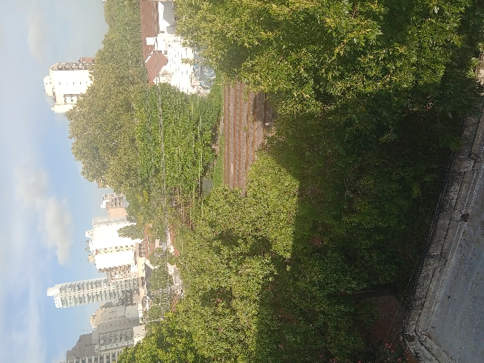 This image captures an elevated, oblique view of an urban landscape in Lomas de Zamora, Argentina, under a bright sky with scattered white cumulus clouds. In the immediate foreground, a worn concrete surface, possibly a rooftop or balcony, is visible, bounded by a low, cracked concrete parapet. Beyond this barrier, dense green foliage occupies the lower and mid-left portions of the frame. Approximately horizontally across the middle of the image, a set of three parallel railway tracks runs, partially overgrown with vegetation, suggesting disuse or low traffic. Overhead electrical or communication wires traverse the scene above the tracks. Beyond the railway, a mix of dense green trees and various urban structures is observed. Several multi-story residential buildings, predominantly white or light-colored and featuring numerous windows, are visible in the background, forming part of a city skyline. Some older, lower-rise buildings with white walls and terracotta roofs are also discernible through and above the trees in the mid-right, with one white structure exhibiting graffiti on its lower facade. No individuals, active subjects, or explicit actions or interactions are present in the scene. The overall environment appears to be a verdant urban area with a blend of older and modern architecture.