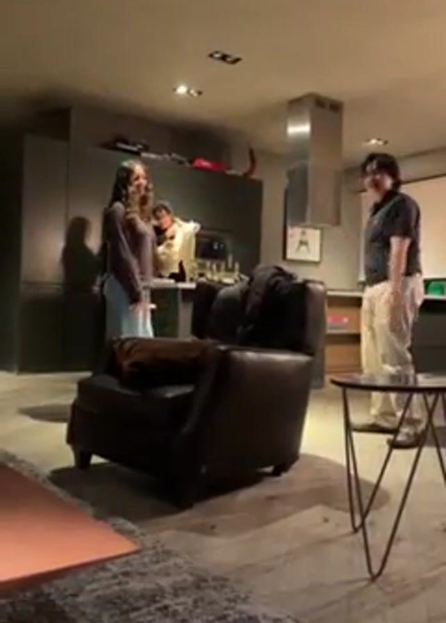 interior of a modern apartment, with a young woman in jeans and a brown top standing near a dark gray kitchen area. A young man in a black polo and khaki pants stands on a small round table, holding his phone. Another individual can be seen sitting on the kitchen counter. The room features a large, dark armchair, a patterned rug, and dark cabinetry in the kitchen area, along with a stainless steel range hood. The man on the table seems to be interacting with the woman, while the person on the counter appears to be occupied with something out of view. The apartment is well-lit with recessed ceiling lights.