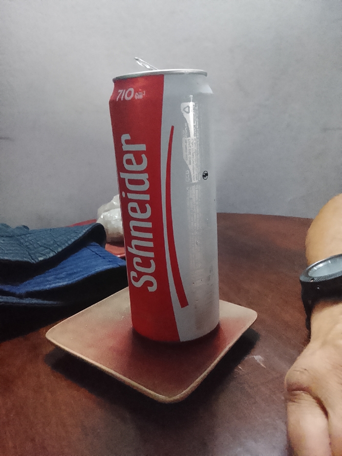 The scene depicts an indoor setting in Unknown, Unknown. A 710 cm³ Schneider-branded aluminum beverage can, open with its pull-tab lifted, stands upright on a square reddish-brown coaster. The can features a prominent red and white label with the word "Schneider" printed vertically in white on a red background, and condensation is visible on its silver surface. This assembly rests on a dark brown wooden table. In the left background, a folded dark blue or black quilted wallet or small bag is present, alongside a blurred white, crumpled object. A plain light grey wall forms the background. In the lower right foreground, a portion of a human forearm with light brown skin is visible, wearing a black-strapped watch with a dark circular face, resting on the table.