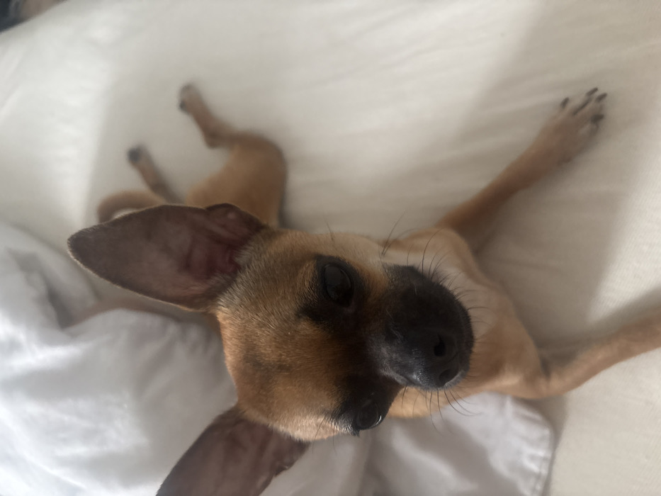 - "An indoor scene in Strazhitsa, Bulgaria, depicts a tan-colored Chihuahua-type dog lying on white bedding" by FM-DSrVq2, licensed under CC BY 4.0