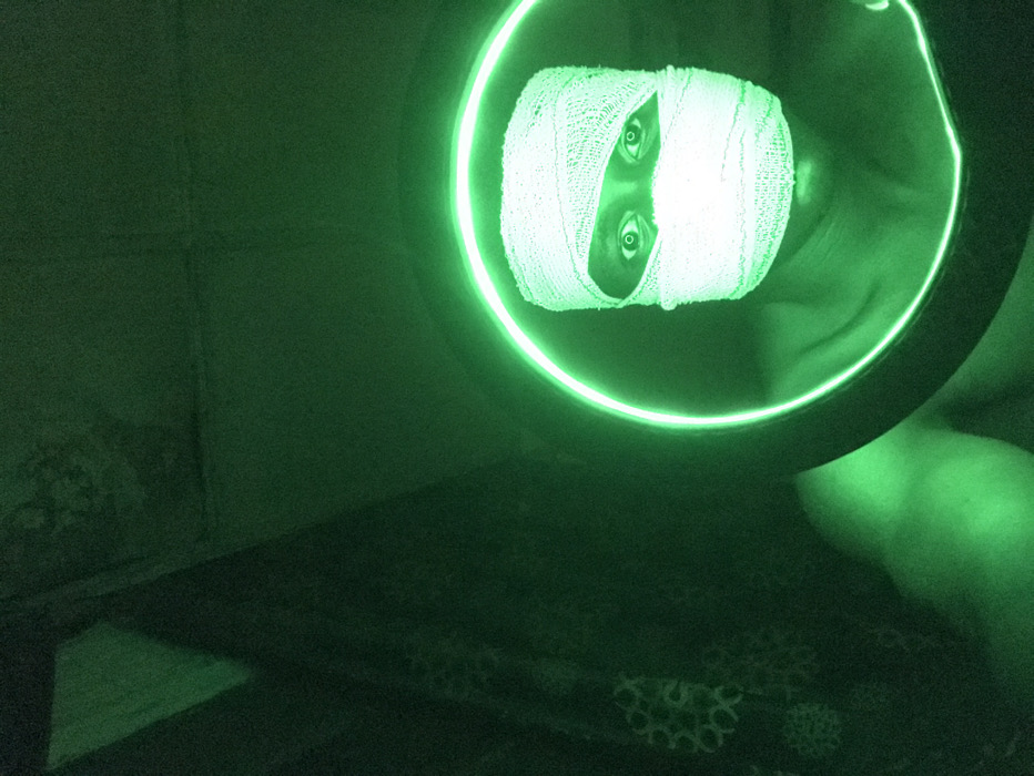 A person's face wrapped in bandages stares out with visible eyes, centered within a glowing green circle. The background is dark and green-tinted. A wall is visible behind a patterned surface. Part of a person's body is visible in the right side. The overall image is eerie and illuminated in a green hue.