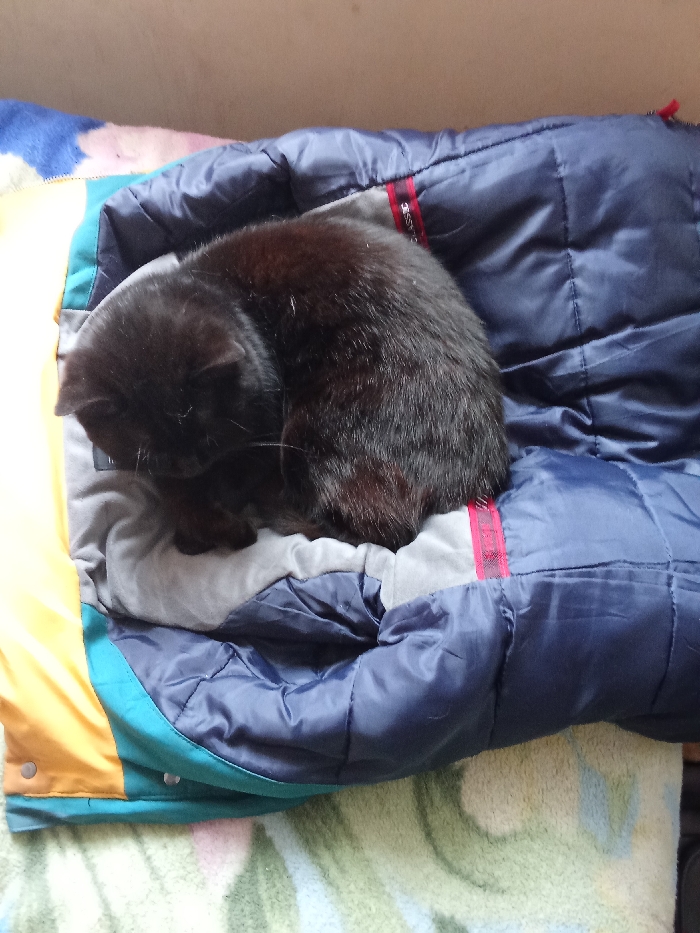 - "A black domestic cat is observed curled tightly in a state of repose within a navy blue padded sleeping bag or winter jacket" by FM-ULG7s2, licensed under CC BY 4.0