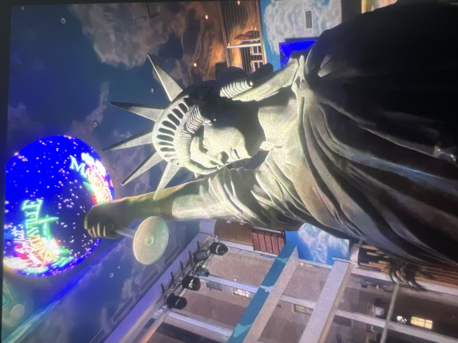 An indoor scene features a large-scale replica of the Statue of Liberty, rendered in a metallic green-bronze finish, angled from the lower right foreground towards the upper left