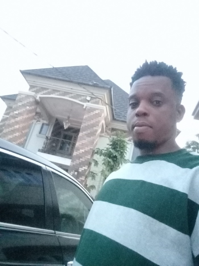 A man poses for a selfie outdoors with a vehicle and building in the background. The building is two-story with a gray roof and a porch. The man has dark hair and a beard, and he's wearing a green and white striped long-sleeved shirt. The car is dark-colored. The overall lighting suggests daytime, although somewhat overcast.