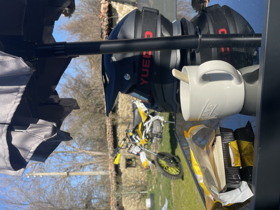 The scene is set outdoors in Mindia, Bulgaria, under a clear blue sky with bright sunlight. In the foreground, a black, reflective table holds several items. A dark grey umbrella pole rises from the table's center-right, with the lower edge of a grey umbrella canopy visible above. To the right of the umbrella pole, a black motocross helmet with red "YUEGD" branded goggles rests on the table. To the left of the pole, a white ceramic mug, embossed with "BAILEY'S," contains a light-colored spoon. Adjacent to the mug on the left is an opened package of white wafer cookies contained within a black plastic tray. In the midground, on a patch of green grass, a yellow and white dirt bike, marked with "ROCKSTAR" branding and the number "10" on its front, is parked on a kickstand. The bike features bright yellow wheel spokes. Behind the dirt bike, a stone wall structure with a small, rectangular opening is visible. The background consists of bare deciduous trees and bushes, and a utility pole, all under a bright blue sky. No individuals are present, and no actions or interactions are depicted.